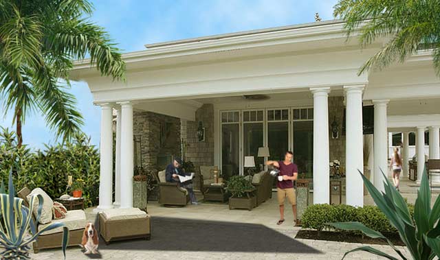 Viele noble Säulen, große überdachte Terrassen, gediegene